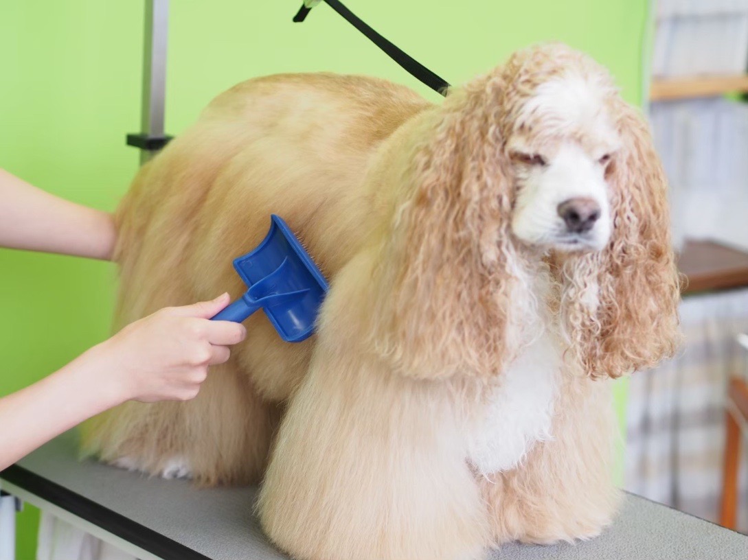 シャンプーの前に被毛の状態を確認し、状態に合わせてブラッシングで抜け毛やもつれを除去します。